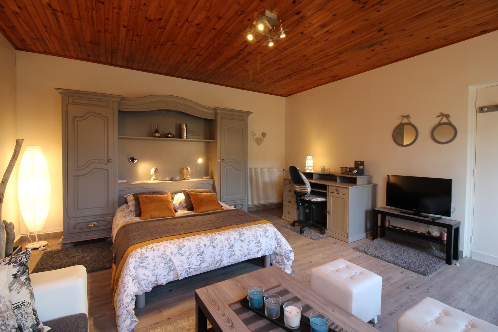 Chambre pont, située en rez-de-chaussée, avec coin salon, murs peints,revêtement de sol gris, bureau, télévision.